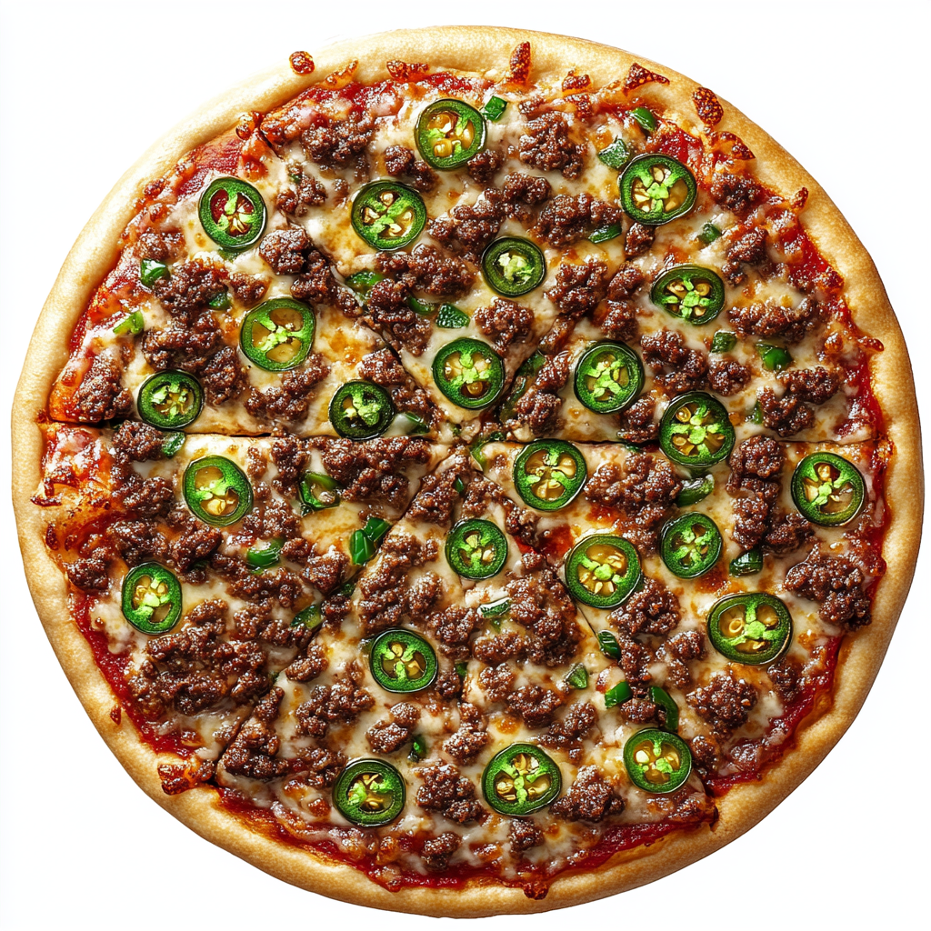 Pizza Mexicana: base + tomate, mozzarella, carne picada, jalapeños.